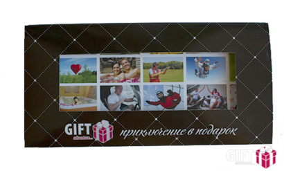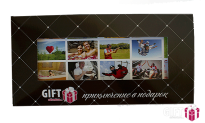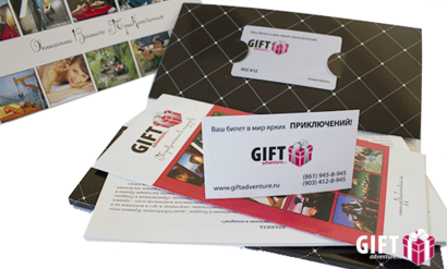 Внутри описание подарка, буклет, правила, визитка, платиковая карта.
